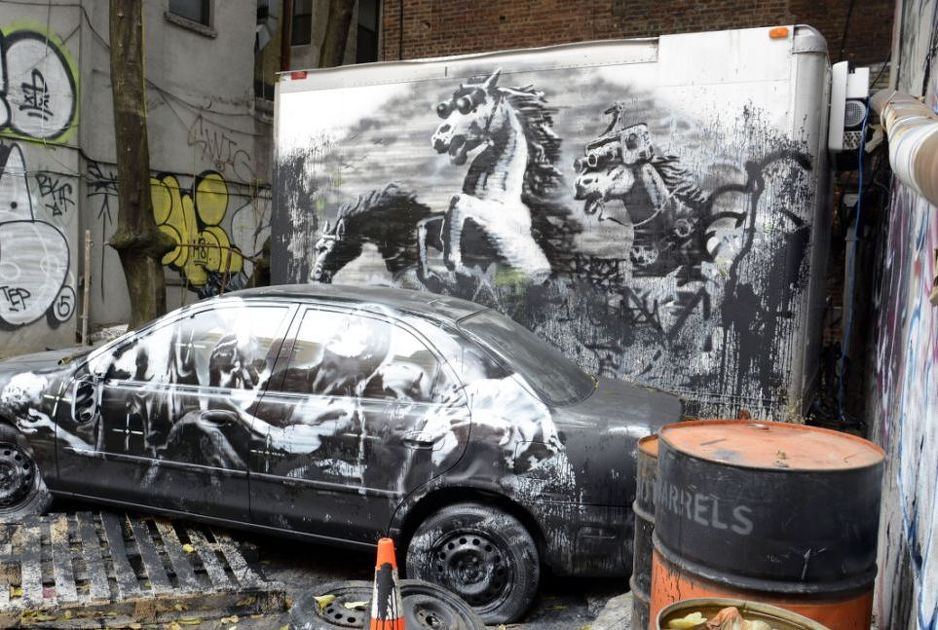 Tajanstveni britanski umjetnik Banksy u okviru svoje njujorške turneje otkrio je jedan od svojih politički najangažiranijih radova. Radi se o Banksyjevom komentaru na rat u Iraku, a predstavio ga je na oslikanom automobilu, postavljenom ispred naslikanih konja u trku, koji nose naočale za noćno gledanje. Automobil, na njujorškom East Sideu okružen je bačvama s naftom, a Banksy je na jednom napisao i telefonski broj pomoću kojeg se dolazi do 39-minutne snimke zračnog napada u Bagdadu. U napadu je poginulo 18 osoba, uključujući i dvoje djece te Reutersovog novinara.