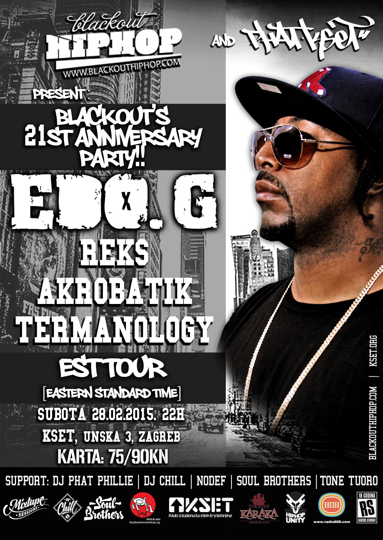 U organizaciji Phat KSET-a i Blackouta, 28.veljače je zabilježen kao hip hop praznik u Zagrebu! Naime, u sklopu 21. rođendana legendarnog Blackout kolektiva, Phat KSET & Blackout zajedničkim snagama, 28.veljače, u KSET dovode četvoricu nevjerojatnih majstora ceremonije – Akrobatik, Termanology, Edo G & R.E.K.S!