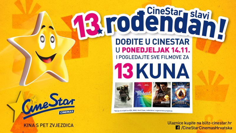 Proslava rođendana zasigurno je jedan od najveselijih dana u godini, a kako CineStar ove godine slavi 13. rođendan, svoje vjerne filmoljupce odlučio je razveseliti i pritom počastiti jednom zaista posebnom poslasticom! Naime, u ponedjeljak, 14.11., sve filmove ćete moći pogledati za prigodnu cijenu od samo 13 kuna! Ova specijalna rođendanska proslava postala je već tradicionalna u CineStar kinima koju na taj dan budu ispunjena do posljednjeg mjesta. Tog dana imat ćete priliku pogledati najnovije filmske hitove poput primjerice animiranog hita ''Trolovi'', Marvelovog briljantnog super junaka ''Doktor Strange'', hrvatsku komediju ''Ministarstvo ljubavi'', ratnu dramu snimljenu prema nevjerovatnoj istinitoj priči redatelja Mel Gibsona ''Greben Spašenih'' i akcijsku avanturu s Tom Cruisom ''Jack Reacher: Nema Povratka'' te mnogi drugi.