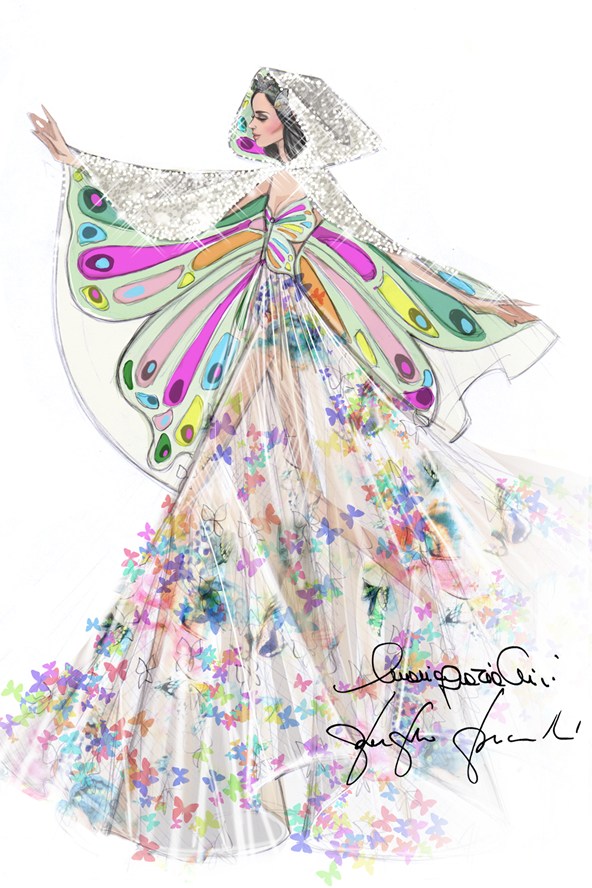 Valentino je za Katy dizajnirao čarobnu maksi haljinu s velikim plaštom, a lajtmotiv su leptiri. Suknja haljine je napravljena od slojeva tila kojeg krase mikro perlice i 3D leptiri, a izgledom se izvrsno uklapa u filozofiju turneje, ali i samu svojevrsnu dječju magiju kojom se Katy voli poigravati.