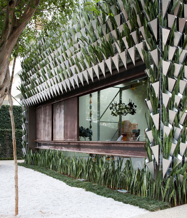 Zeleni zid napravljen je od sansevierie trifaciate, biljke koja je u brazilskoj popularnoj kulturi poznata po zaštiti od uroka te ljekovitosti. SuperLimão Studio pomogao je dizajnerima staviti 9.000 sadnica u čak 3.500 aluminijskih vaza koje su postavljene na armaturnu mrežu dok je sistem protoka vode takav da se slijeva iz jedne vaze u drugu. Atraktivan I koristan, ovaj “živi” zid pravi je primjer zelene budućnosti u modernoj arhitekturi.