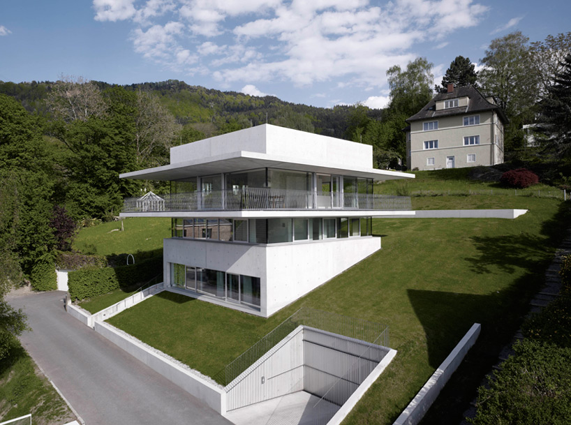 Smještena na obronku iznad grada Bregenz u Austriji, „House By The Lake“ dizajnersko djelo Marte Marte Architekten nudi pogled na krajolik doslovno sa svih strana. Kuća ima betonsku konstrukciju kvadratnog plana i identična uzvišenja sa svih četiri strana, a balkoni na gornjem katu i potkrovlju izgledaju poput ekstenzija koje se protežu 360 stupnjeva oko kuće kako bi ukućani imali savršen pogled na jezero i grad iz bilo kojeg kuta .