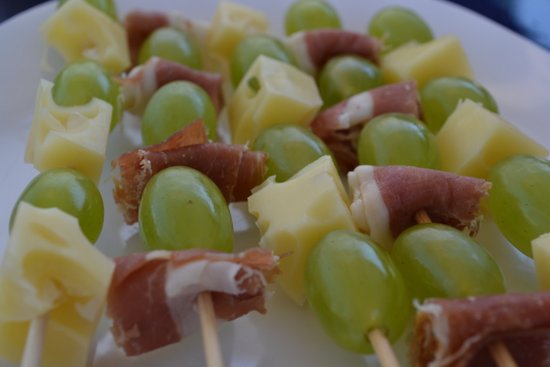 Izrežite sir na komadiće veličine bobe grožđa. Narežite pršut na trakice i zarolajte ih. Na drvene ražnjiće ili čačkalice složite bobu grožđa, komadić sira, komadić pršuta i tako naizmjence.